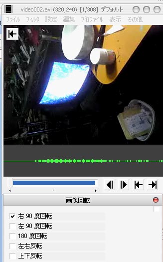 そうして aviutlで先ほど生成したaviファイルを開いたら、「設定」メニューから画像回転の設定で回転方向と角度を決めます。
